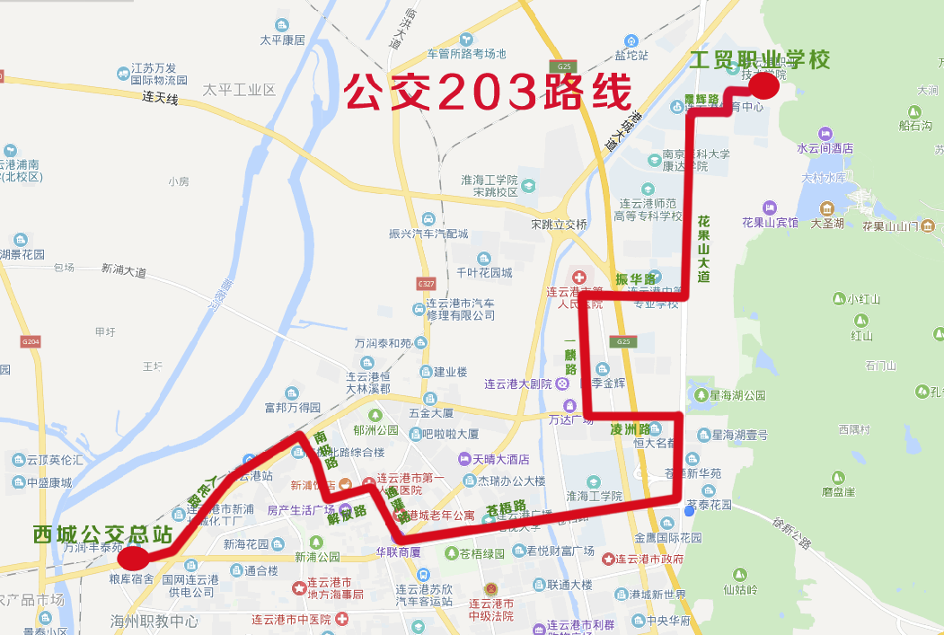 線路走向:西城公交總站發車海連路、人民路、南極路、解放路、通灌路、蒼梧路、花果山大道、凌洲路、一麟路、振華路、花果山大道、晨光路至工貿職業學校