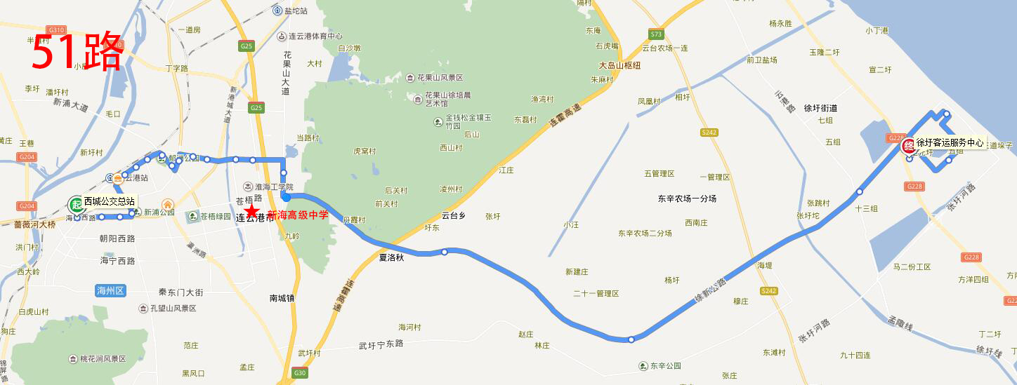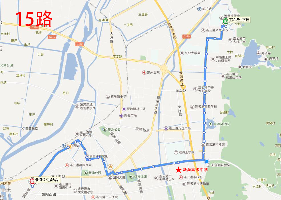 新海高級中學:地址在海州區蒼梧東路58號,附近途徑公交線路有3路、5路、10路、15路、24路、51路、121路、游2路;
