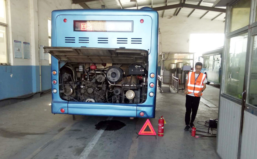 本次年檢工作從8月初開始,共檢驗61臺天燃氣車輛(其中包含18米海格車輛30臺、12米宇通車輛31臺)。主要檢測內容有以下三項:一是檢查發動機、地盤、車身及其附屬設備是否清潔、齊全、有效,漆面是否均勻美觀,與初檢是否相符。二是檢驗車輛的制動性、轉向操作性、燈光、排氣及其它安全性能是否符合“機動車安全運行技術條件”的要求。三是檢驗車輛的三角牌、滅火器是否齊全有效,行駛證、號牌、發動機號及車架號的車輛檔案所有登記是否與車況相符,車輛是否辦理了審批和異動、變更手續等。
