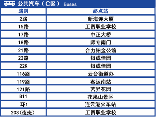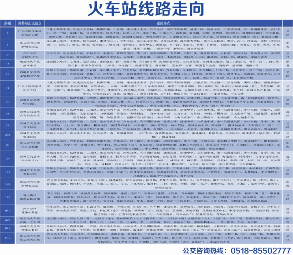 西城公交總站、連云港火車站、汽車總站、市一院通灌院區 、步行東街、蘇欣快客站、客運南站、南城路口、板浦西山、華豐紡織、板浦中學(初中部)、板浦醋廠、銀成佳園