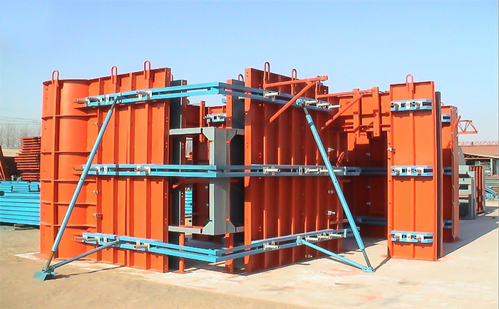 模板采用3.5mm厚鋼板卷制成型,剛度好,重量輕,吊裝方便,系統(tǒng)牢固耐用,滿足建筑的技術(shù)安全要求。模板背面采用小鋼板,應(yīng)具有足夠的強(qiáng)度和剛度,保證混凝土澆筑過程中模板系統(tǒng)的變形控制在1-3mm以內(nèi),內(nèi)外角模板為一塊完整的鋼板,整個鋼板由卷板機(jī)轉(zhuǎn)到一個小的弧形角,從90°處軋制,使分割部分不存在焊縫。豎向框架上的鋼板采用進(jìn)出口形式張拉,并選用可調(diào)配的方法,只有大模板系統(tǒng)的節(jié)點(diǎn)剛性好,才能克服原則上墻體澆筑滲漏的常見質(zhì)量缺陷。梁與墻遮陽相結(jié)合,消除預(yù)埋鋼筋和單獨(dú)梁洞口的問題,后墻洞口三面寬100mm,形成15mm厚的門框,可有效防止后墻洞口清理后的滲透;模板系統(tǒng)通用性強(qiáng),結(jié)構(gòu)簡單,制造方便,拆裝方便,充分滿足了模板的嚴(yán)密性和靈活性要求。