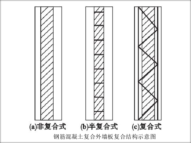 鋼筋混凝土復合外墻板主要是由外部的鋼筋混凝土結構承重層和內部的夾芯保溫層組合而成的墻板結構,典型的構造有如下圖三種復合形式。鋼筋混凝土復合外墻板根據夾芯保溫層所用材料的不同,有承重混凝土巖棉復合外墻板、混凝土膨脹珍珠巖復合外墻板和三種類型的復合外墻板。