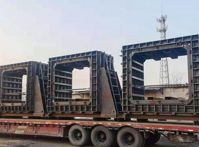 3、 端模系統。包括端模面板及端模框架、開合系統、緊固定位機構。端模系統是形成管廊構件端(側)面的部件,其開合動作的簡便可靠要滿足管廊模具的易操作性。