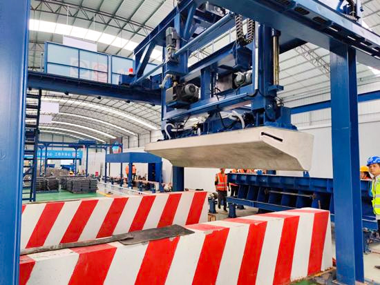 該生產(chǎn)線包含六大功能區(qū):包含鋼筋籠制作區(qū)、混凝土澆筑區(qū)、蒸汽養(yǎng)生區(qū)、拆模清理區(qū)等,各區(qū)域由軌道串聯(lián)成一個環(huán)形整體,區(qū)域間配備了機械臂、擺渡車和移動小車,實現(xiàn)工序無縫銜接。